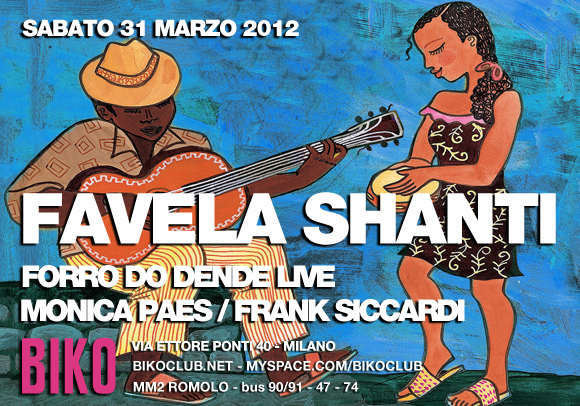 I Forrò do Dende, con il loro live set coinvolgente e struggente, faranno scatenare il ballo di coppia sulla comoda pista del Biko. Monica e Frank aggiorneranno l’affezionato pubblico di Favela Shanti con le novità che hanno messo in valigia in questi ultimi mesi estivi, spaziando come sempre fra tutti i generi danzerecci brasiliani, più ‘suonati’ la prima, più ‘elettronici’ il secondo. Rebola!